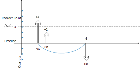 When a subsequent supply event is planned and placed on the time line, the posted decrease reminders are investigated one by one up until the planned date of the supply while updating the projected inventory. During this process, the reorder point level of the internal increase reminder may be reached or crossed.