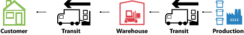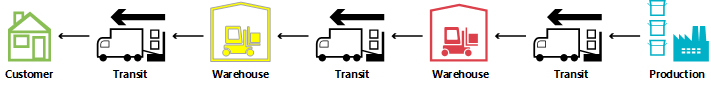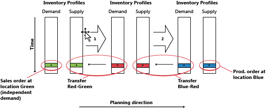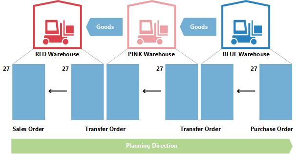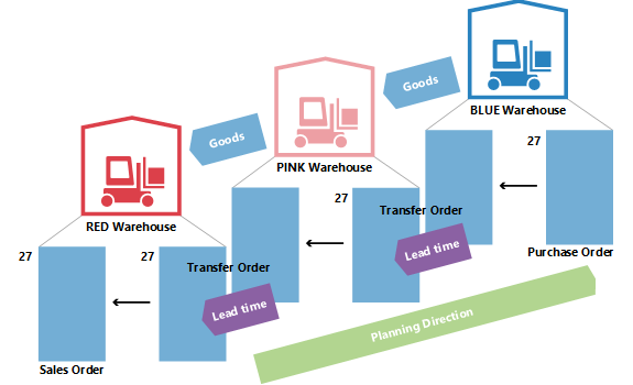 In this example, a customer orders the item at location GREEN. Location GREEN is supplied through transfer from the central warehouse RED. The central warehouse RED is supplied by transfer from production on location BLUE.