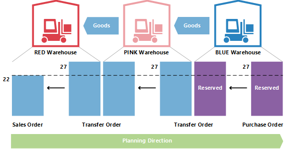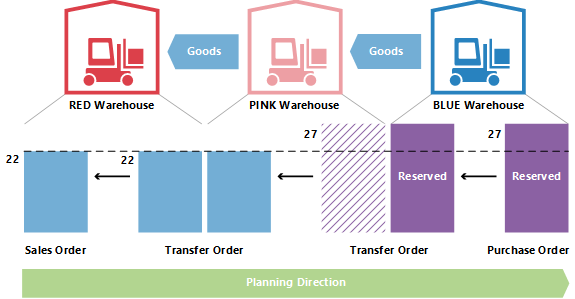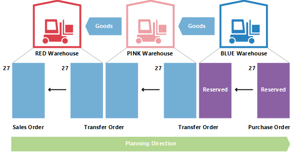 In this example, BLUE SKU is set up with the Order reordering policy, while PINK and RED use Lot-for-Lot. When a sales order of 27 is created on location RED, it will lead to a chain of transfers with the last joint at location BLUE being reserved with binding. In this example, the reservations are not hard reservations created by the planner at PINK location, but bindings created by the planning system. The important difference is that the planning system can change the latter.