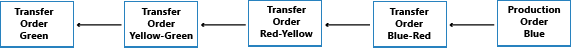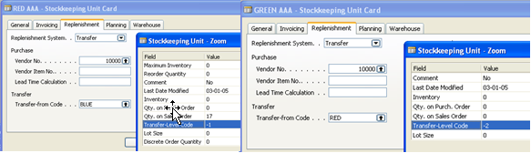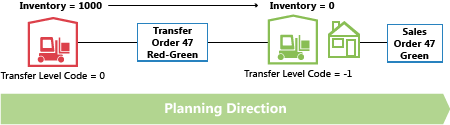 The transfer level code will be 0 for SKUs with replenishment system Purchase or Prod. Order and will be -1 for the first transfer level, -2 for the second and so on. In the transfer chain described above, the levels would therefore be -1 for RED and -2 for GREEN, as shown in the following illustration.