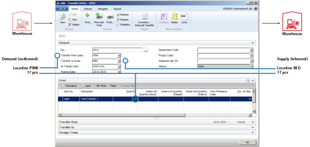 One fundamental aspect that makes transfers in planning different from purchase and production orders is that a transfer line represents demand and supply at the same time. The outbound part, which is shipped from the old location, is demand. The inbound part, which is to be received at the new location, is supply at that location.